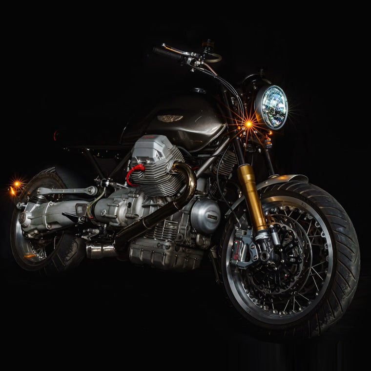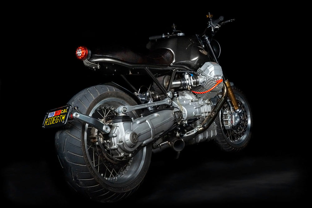 Our second GTM® build, also based on Moto Guzzi’s most venerable “gentleman’s racer” Tonti twin shock frame mated to their modern monoshock single-sided-swing-arm CARC with rising rate suspension. Sticking with the most modernized 2-valve single cam pushrod twin-plug motor, we maximized flow using our in-house built intake, GTM® X-Fire exhaust and fully dynamic fueling. Our styling focus was on the incredible circa 1960’s Ferrari 250 GT, paint matched period color down to the Monza gas cap, riding on aluminum tubeless wheels with handmade Discacciati Italia brake components. Definitely one of the coolest modern/retro Guzzis on the planet.