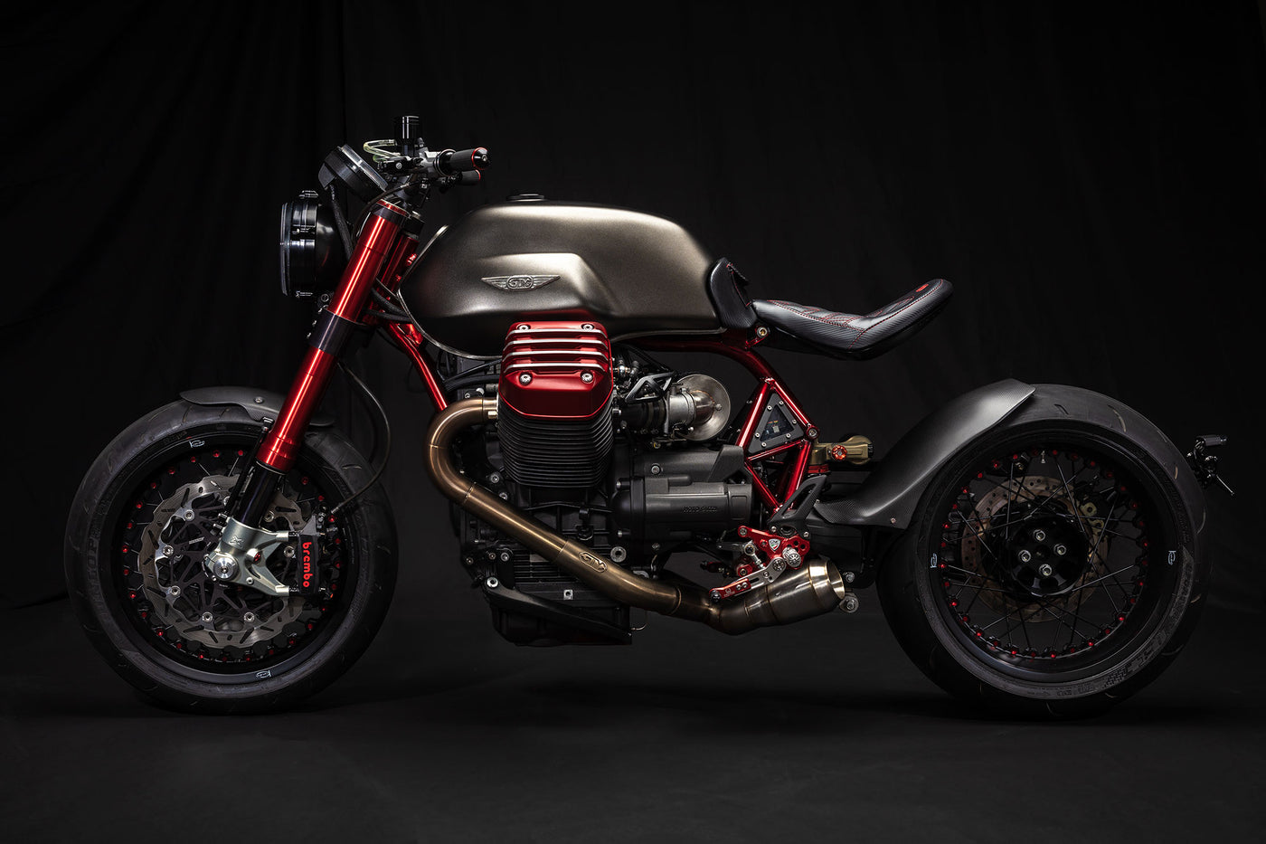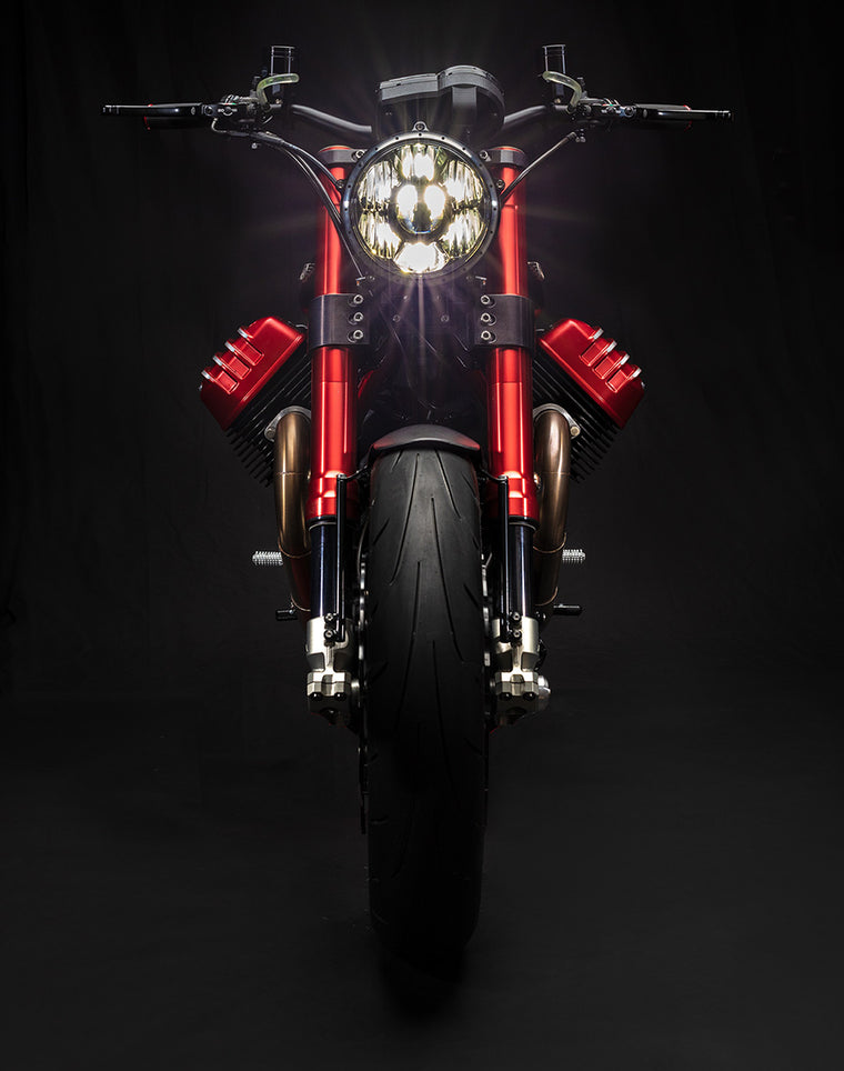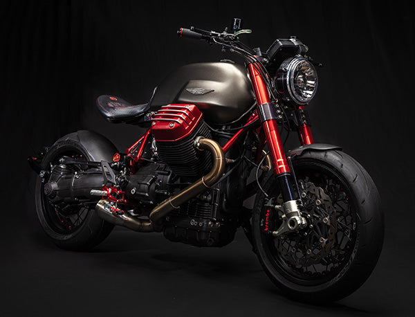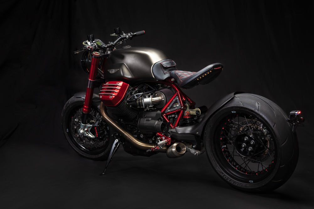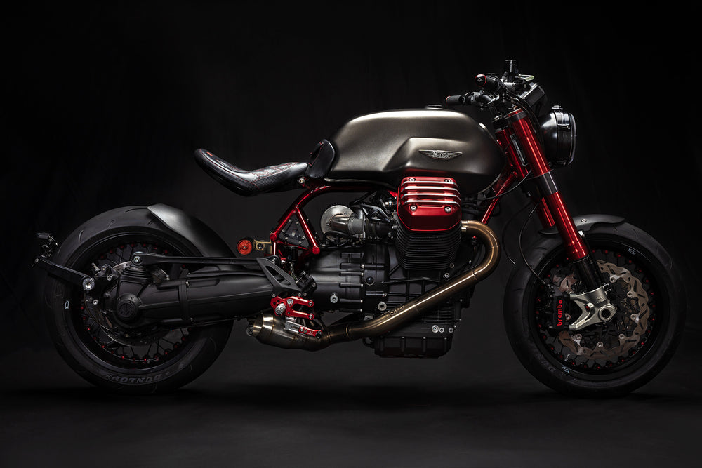 Our very first full-frame GTM® build was made to stretch the boundaries of a modern Guzzi. Starting with the cantilevered solo seat with frenched-in LED lighting, and dripping in a translucent red frame and matching valve covers, we kept with the most modern of components to make it go, stop and turn as good as it looks. Showing what can be done with a stock displacement 1200-8V engine, with our intake and X-Fire exhaust, cranking out a solid 120 rwhp, Marzocchi Works 50mm forks, Mupo Racing shock, and Kineo wheels, it’s simply one of the most visually stunning Guzzis built. Either bring us your plated CARC Guzzis to convert, or let us source one -- CONTACT US to build you one. Pricing Starts ~$19.5k using your CARC Guzzi.