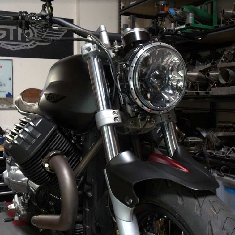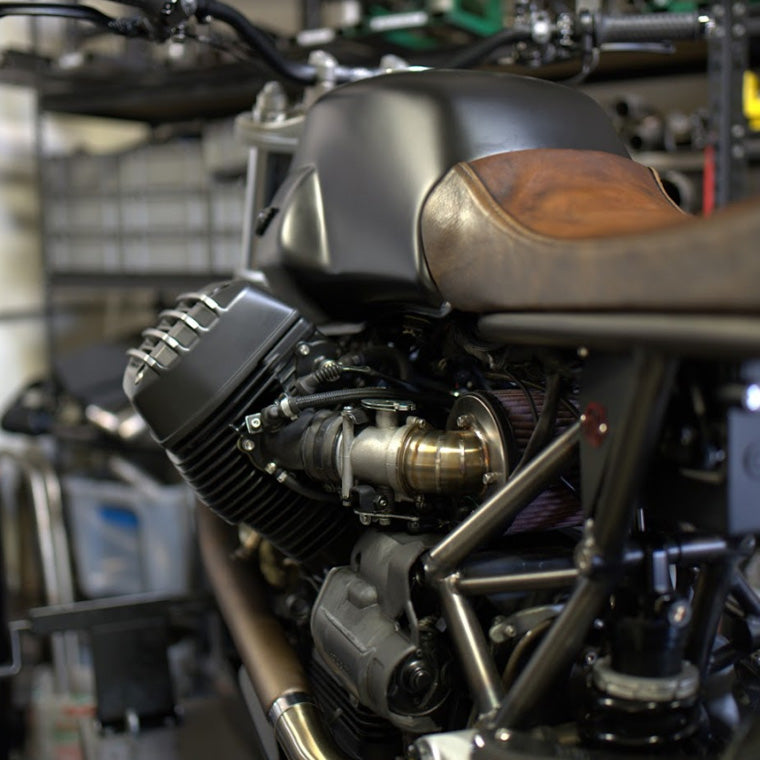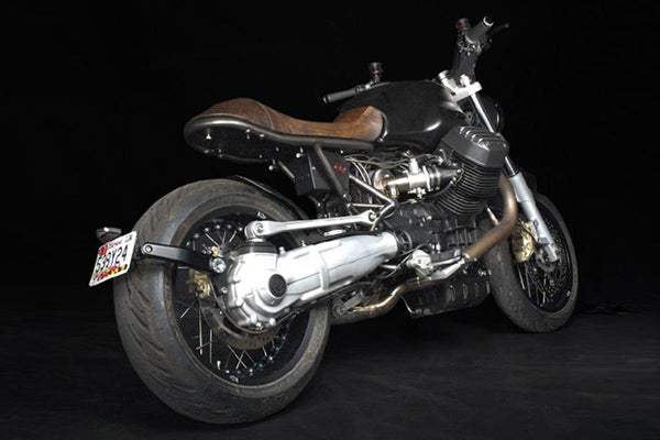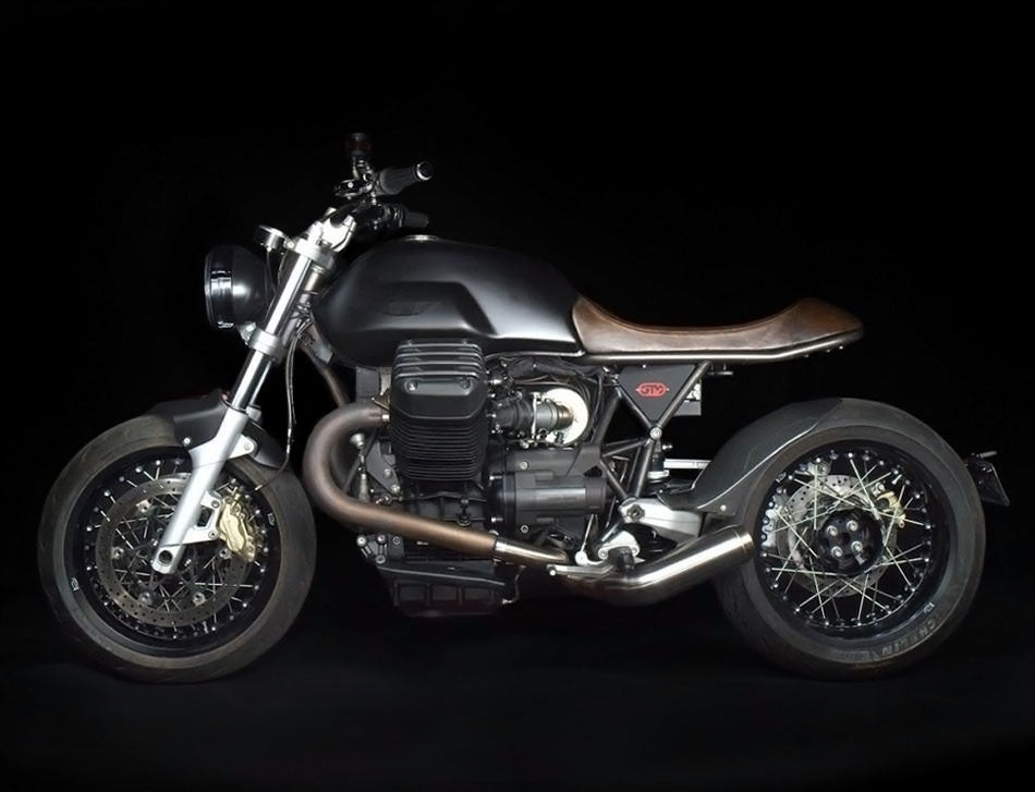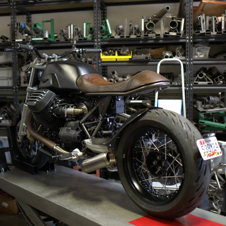 Using a Norge 1200-4V as a donor, this "Mad Max" build was the vision for this Mid-Atlantic custom. By request, leaving the engine and driveline mostly stock, including the stock exhaust headers. Once our GTM magic was applied, it hammered down 114 rwhp on our Axis Dyno. ABS brakes remain, making this our very first ABS build. Built to be ridden far and fast, much of the stock componentry was reused. We lowered and revalve/resprung the stock forks, and mated our standard GTM® Monoshock, but fitted Kineo's incredible tubeless spoked wheels with stock brake calipers and rotors, but topped with Brembo RCS pumps and handfuls of Rizoma CNC art. This is a long solo seat GTM® 2.x frame, built to order. She has been named Mona Lisa by the owner.